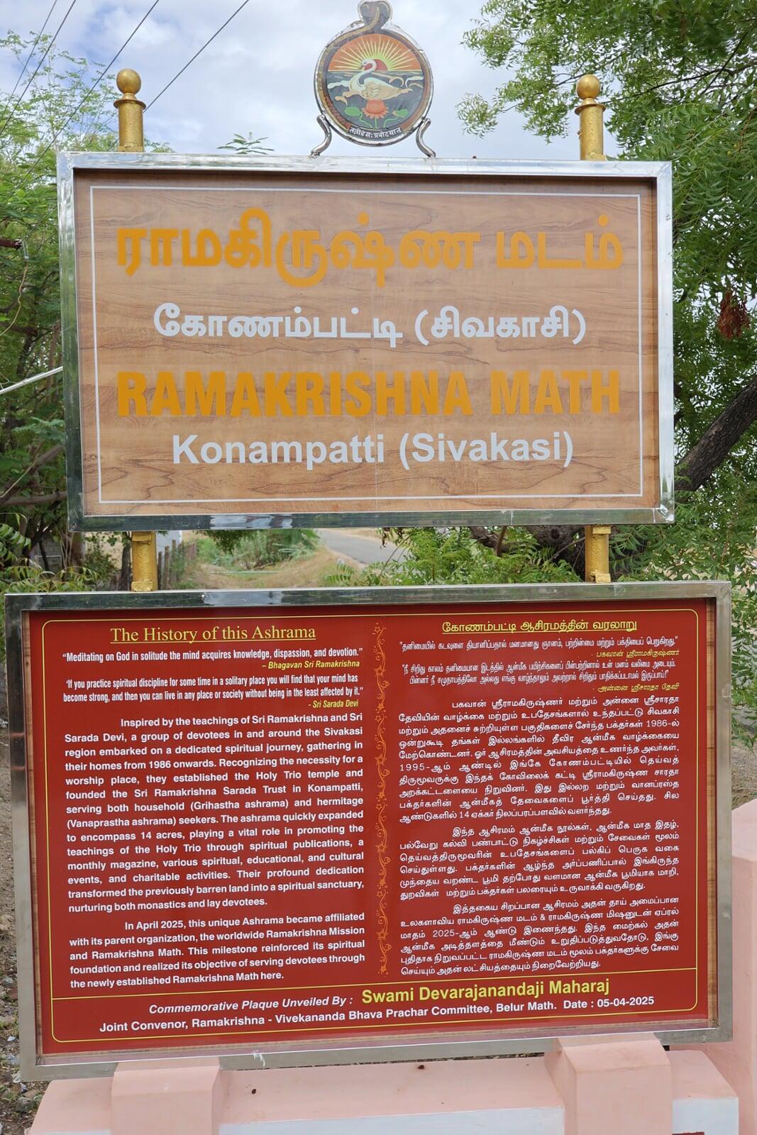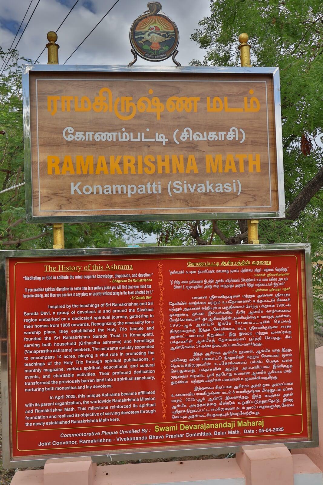 Inspired by the teachings of Sri Ramakrishna and Sri Sarada Devi, a group of devotees in and around the Sivakasi region embarked on a dedicated spiritual journey, gathering in their homes starting in 1986. Recognizing the necessity for a worship place, they established the Holy Trio temple and founded the Sri Ramakrishna Sarada Trust in Konampatti, serving both households’s (Grihastha ashrama) and the hermitage’s (Vanaprastha ashrama) seekers of God. The ashrama quickly expanded to encompass 14 acres, playing a vital role in promoting the teachings of the Holy Trio through spiritual publications, a monthly magazine, various spiritual, educational, and cultural events, and charitable activities. Their profound dedication transformed this previously barren land into a spiritual sanctuary, nurturing both monastics and lay devotees.